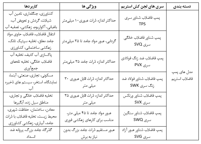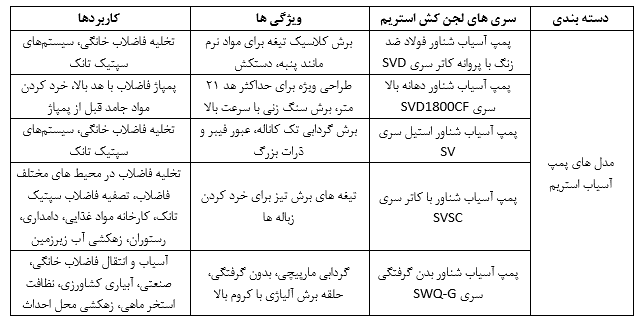 به طور کلی، پمپ لجن کش استریم به دو دسته کلی پمپ لجن کش فاضلاب و پمپ لجن کش آسیاب یا خردکن دار تقسیم می شوند: