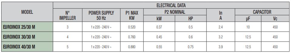 همانطور که قبلتر نیز اشاره کردیم، پمپ داب EUROINOX 40/30 M با برق تک فاز فعالیت میکند. دور موتور این پمپ آب برابر 2900 دور در دقیقه بوده و سطح حفاظت برد ترمینال در این پمپ IP55 است. همچنین کلاس عایق بندی این محصول F و درجه حفاظت آن IP44 است.
