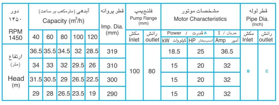 جدول مشخصات پمپ گریز از مرکز مدل 315-80: